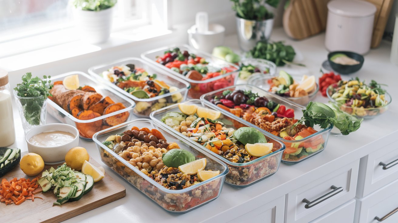 A bright, inviting kitchen counter filled with vibrant vegetarian meal prep dishes. Picture several glass containers arranged in neat rows, showcasing colorful meals like roasted sweet potato burrito bowls, quinoa and veggie salads, chickpea curries, and zucchini noodles with pesto. Include garnishes of fresh herbs, lemon wedges, and avocado slices. The scene is well-lit with natural light streaming in, emphasizing the freshness and variety of the ingredients. A wooden cutting board with chopped vegetables and a bowl of tahini sauce sits nearby, creating a warm, meal-prep-in-progress vibe.